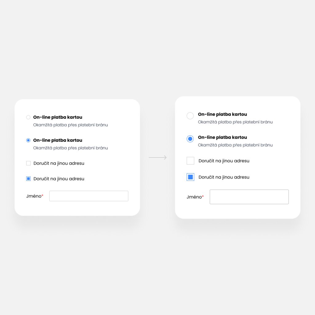 Zvětší radio buttony a checkboxy v košíku i pokladně (např. u dopravy, platby, souhlasů apod.).